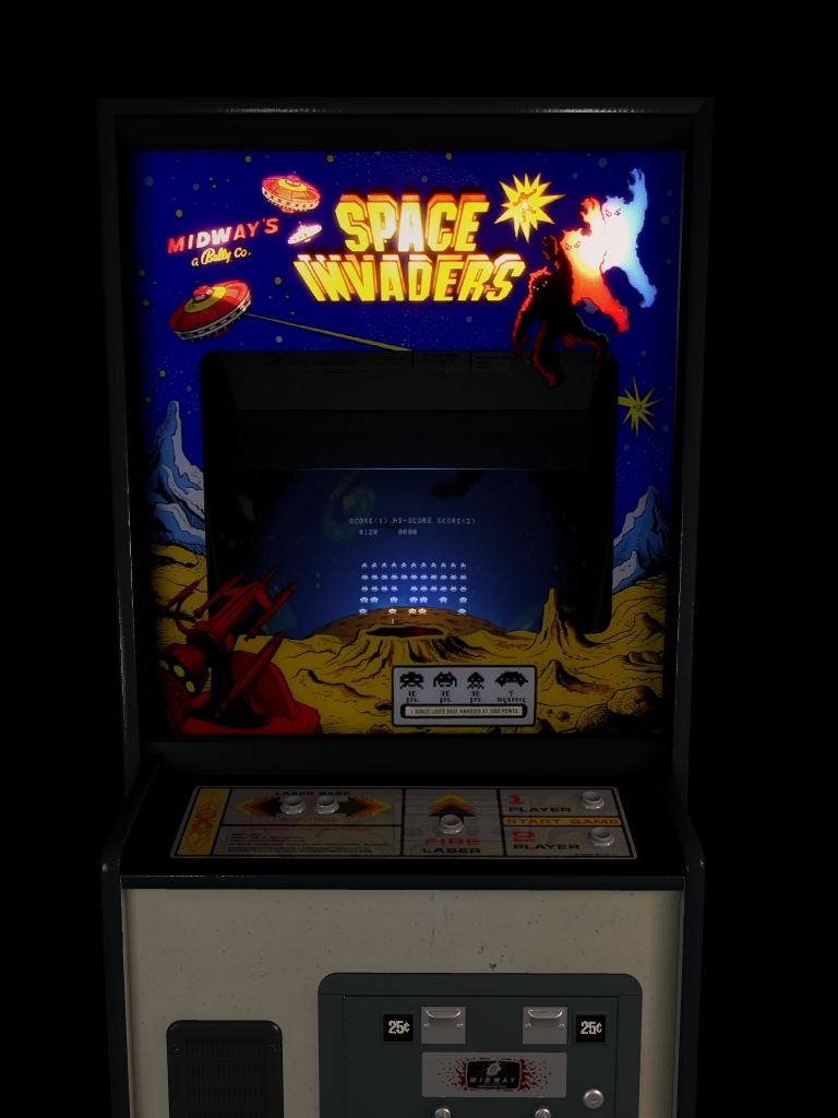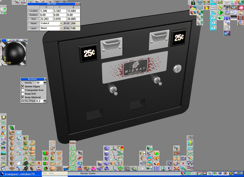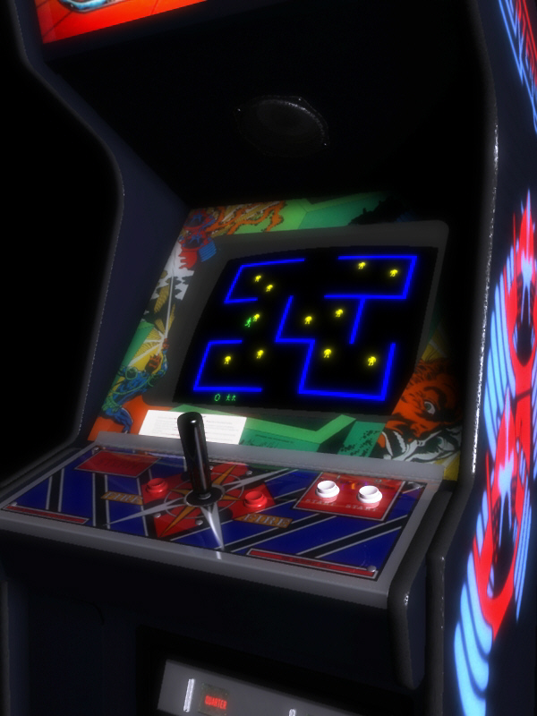 DOWNLOAD THE MOVIE HERE (140MB) Tron. Turned out really sweet. It's such a gorgeous machine to begin with. I'm going to make some animations of just this machine it looks so nice. Take time to notice the branding on the blacklight tube and the wiring inside the joystick. There are even solder blobs holding the ends of the wire to the leaf switch in the stick. Rowe BC-25 Bill Changer Couple of Time-Out renders with the games I have modeled so far. Also trying out some different treatments for the mall interior. Trying for that '70s Springfield Mall look, but this isn't quite doing it for me. I did the "Change" sign that goes in the rear of the arcade. Completed work on Space Fury. Completed work on Zaxxon. Should be a simple matter to retheme the cabinet for Space Fury and Eliminator. Check it. Also added the inner backdrop and mirror assembly to Battlezone and did some final cleanup and tweaks. I think that machine is done now too! I finally got disgusted with my standard button model so I redid it from scratch. See the photo below for comparison. Much more accurate now. The hard part is going to be going through all the existing models and replacing the buttons. I've been thinking about what game to model next - I think I'm going to do Zaxxon because I can use the same cabinet model for Eliminator, Space Fury, and a couple other machines that use the same cabinet. In other news, I've ordered a brand-new computer system from Alienware, and it is supposed to ship sometime this month. This is a monster system with the latest Intel Core 2 CPU. I should have enough power to be able to really crank renders out. I promise I'll post some Time-Out test animations once I have the new system in my grubby hands. In other news, I've been thinking a lot about the rest of the mall. I stumbled across a few renders from back before I added the beginnings of the rest of the mall, and I have to say that I prefer it without the mall. It looks much more dramatic with just the darkened suggestions of the rest of the mall and the starkly lit Time-Out entrance. I am now rethinking things and may just revert back to the darkened entrance only instead of an entire mall hallway. |